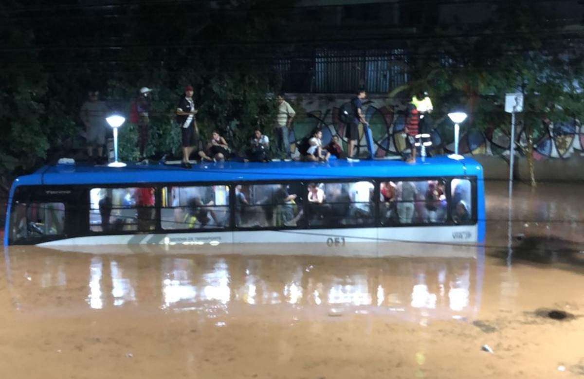 Temporal de mais 100 milímetros deixa passageiros ilhados em teto de ônibus e abre cratera em Juiz de Fora